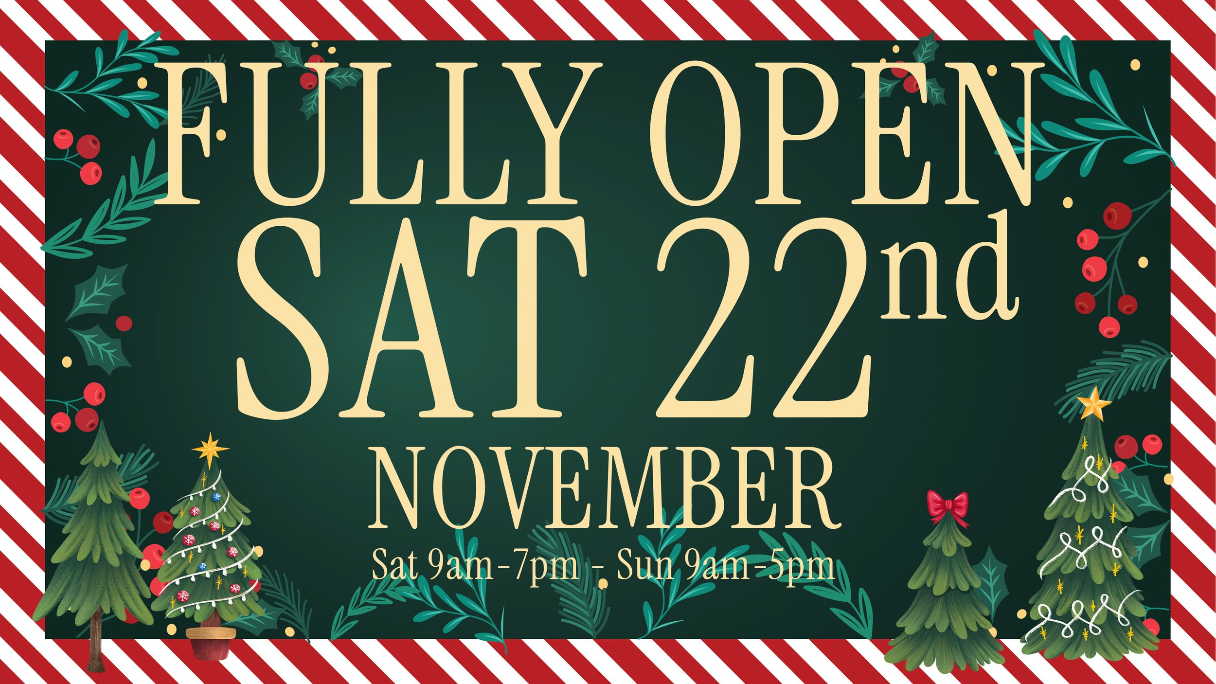 Fully Open Times: 9.00 am to 7.00pm Monday to Saturday and 9.00 to 5.00pm on Sundays.